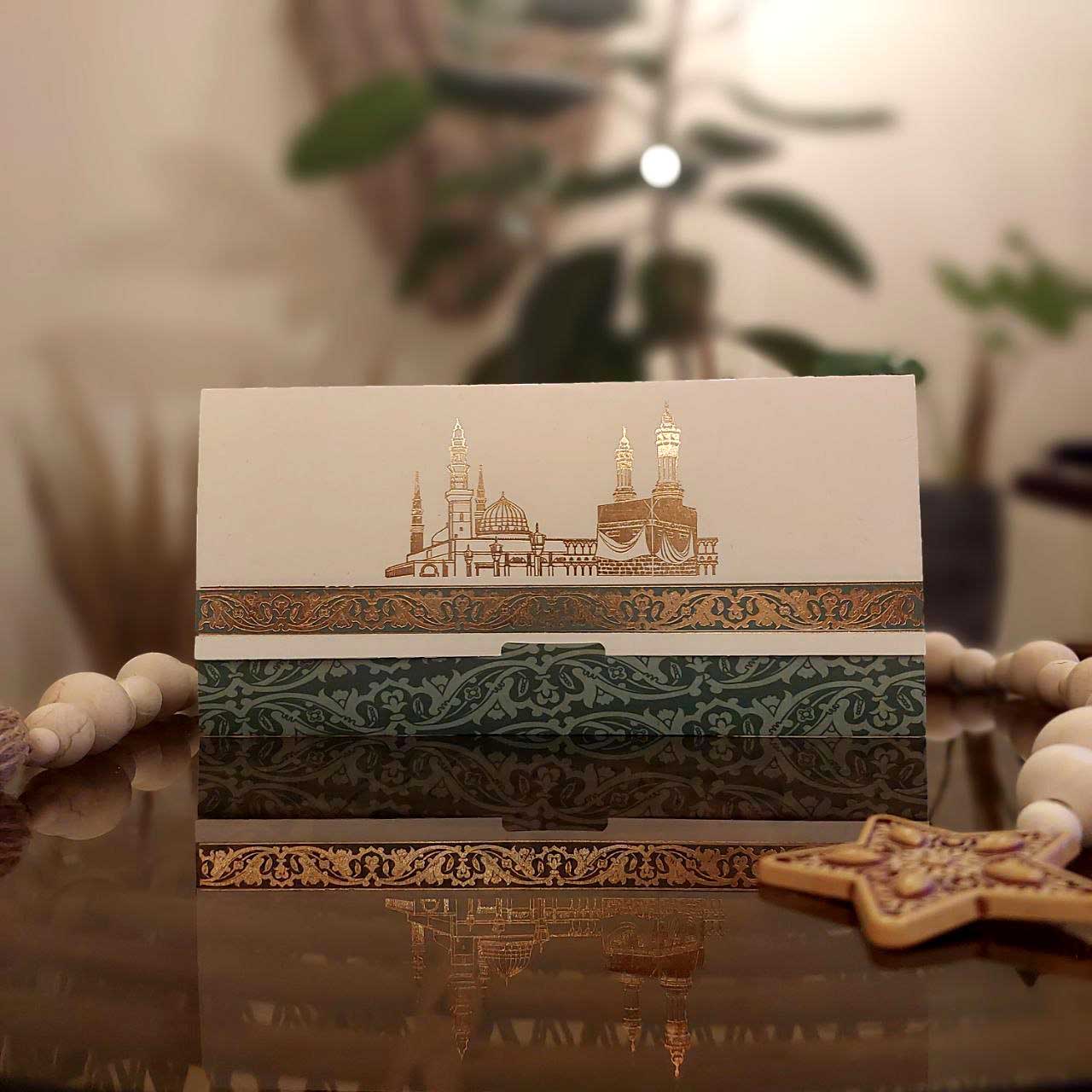 این کارت مکه کد 143 به صورت سه لت طراحی شده است به نحوی که وقتی بصورت باز شده باشد متن و مشخصات حجاج قابل مشاهده می باشند و هنگامی که بسته باشد بصورت پاکت میباشد و در قسمت پشت آن کادری برای نوشتن اسم مهمان ها قرار دارد، از دیگر ویژگی های این کارت حج نوارهای طلایی و اسلیم ها و وکتور های طلایی کار شده توسط ما روی این کارت دعوت جلوه بسیار زیبایی به این کارت دعوت حک بخشیده است و برای دعوت مهمانها به ولیمه حجاج قطعا میتواند یک کارت دعوت رسمی زیبا و خیره کننده بشمار بیایید.